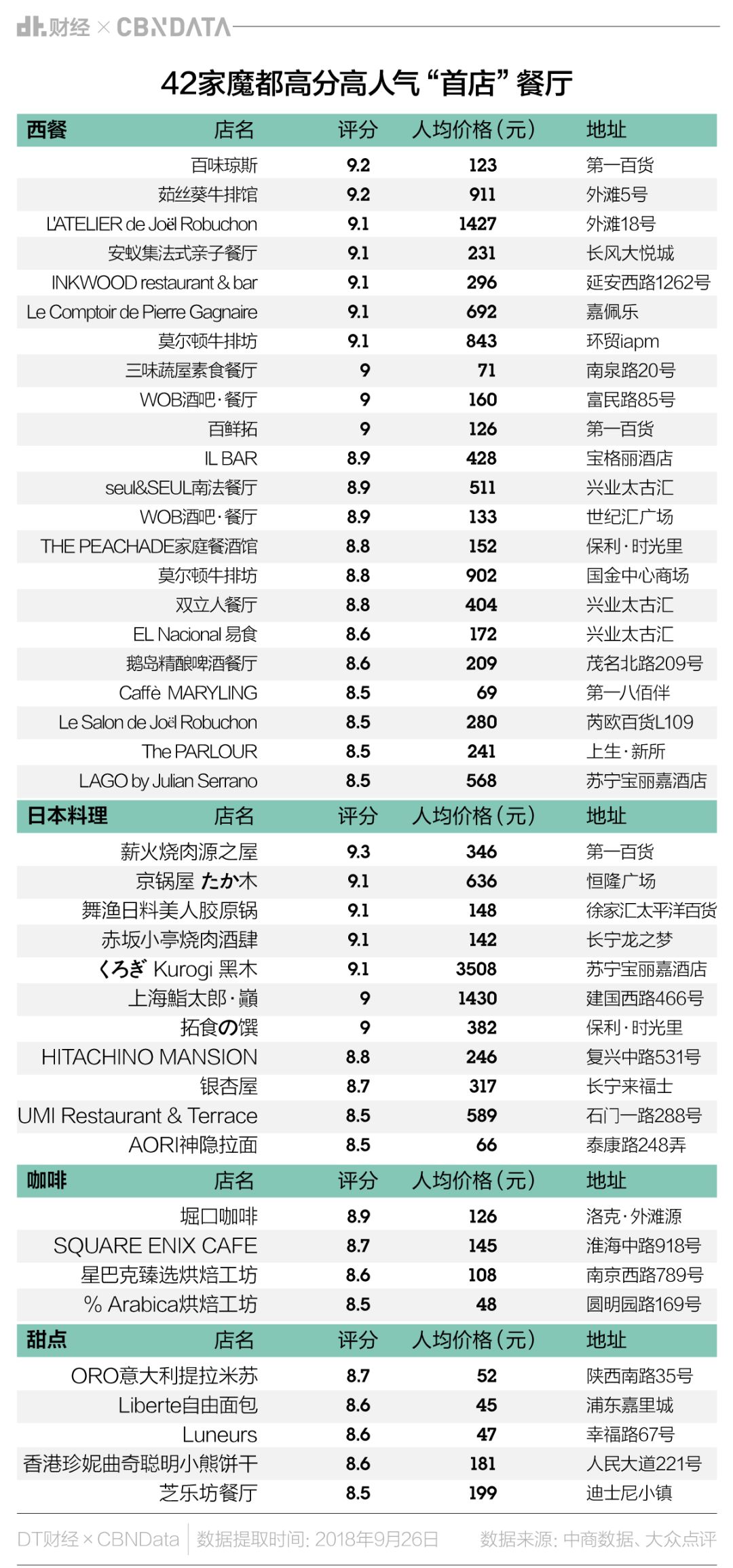 最后,为了给你献上一份实用的“魔都赏味攻略”,DT君从打分、评论数、人均等角度出发,精选了42家“首店”,收好咯~