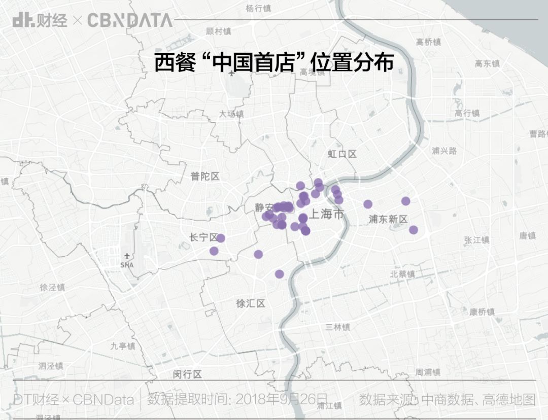类型众多的西餐,则牢牢守住了静安区和黄浦区的几个中心地段。南京西路上的兴业太古汇、芮欧百货、静安嘉里中心,南京东路上的第一百货商场,淮海中路的环贸iapm都吸纳了大部分的西餐“首店”。