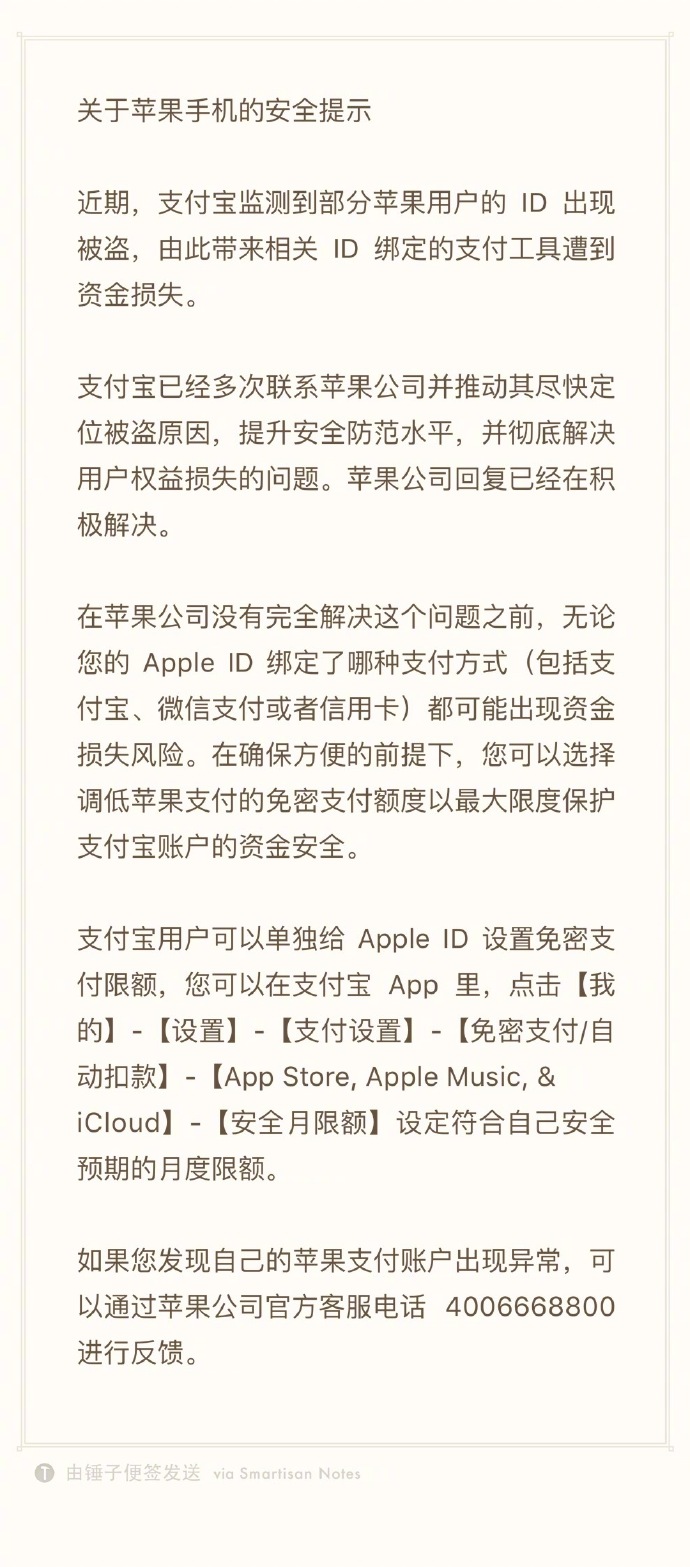 支付宝表示,已经联系苹果公司尽快定位被盗原因,同时建议用户调低免密支付额度以最大限度的保护支付宝账户安全。苹果方面回复支付宝称已经在积极解决问题。