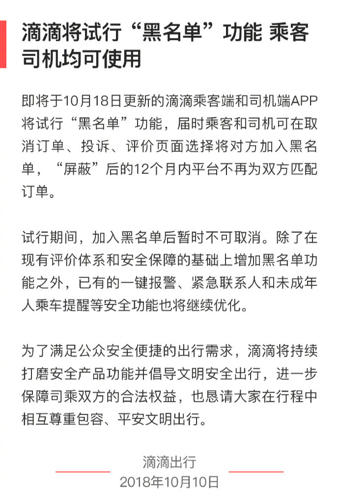 10月10日,滴滴出行官方微博称“滴滴将试行‘黑名单’功能 乘客司机均可使用”。滴滴表示,即将于10月18日更新的滴滴乘客端和司机端APP将试行“黑名单”功能,届时乘客和司机可在取消订单、投诉、评价页面选择将对方加入黑名单,“屏蔽”后的12个月内平台不再为双方匹配订单。 试行期间,加入黑名单后暂时不可取消。除了在现有评价体系和安全保障的基础上增加黑名单功能之外,已有的一键报警、紧急联系人和未成年人乘车提醒等安全功能也将继续优化。