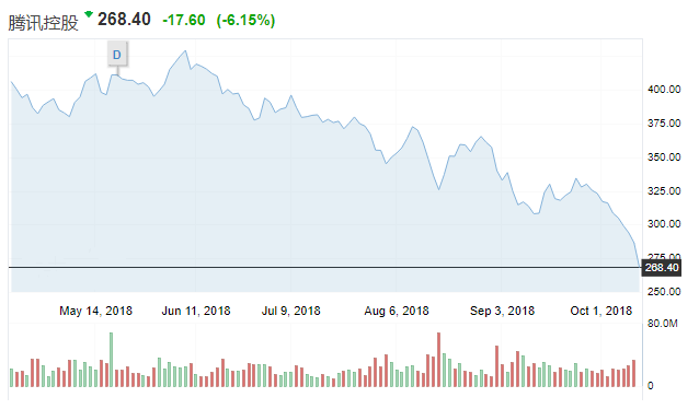 10月11日,腾讯控股股价跌破270港元,总市值跌破2.6万亿港元。