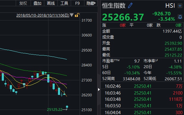 10月11日,香港恒生指数开盘跌3%,下破26000点,盘中跌超1000点,午后跌幅一度扩大至4%,尾盘跌幅小幅收窄,截至收盘,香港恒生指数跌3.54%,报25266.37点,创近一年半新低。国企指数跌3.35%;红筹指数跌3.3%,逾500只港股创新低。
