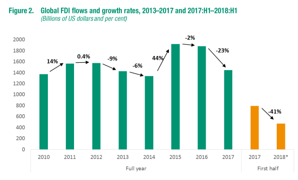 根据联合国贸发组织最新发布的《全球投资趋势监测报告》(下称《报告》),全球外国直接投资(FDI)在2018年上半年下降了41%,约为4700亿美元。其中,美国FDI流入也下降了73%,为460亿美元。究其原因,美国跨国公司在税制改革后将海外子公司留存收益大量汇回美国,是导致全球FDI下降的主因。