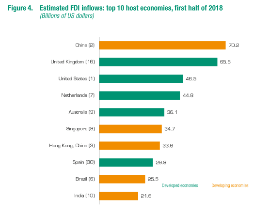 同一时间,中国成为了全球FDI最大吸收国,上半年利用外资约为700亿美元;排名第二的是英国,其外资流入从2017年的低水平增加到660亿美元;全球排名第三的是美国,其FDI流入量为460亿美元,下降了73%。