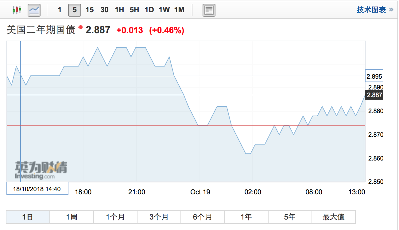 更值得一提的是,2年期美债收益率也于10月18日飙升至2.9%上下,创2008年金融危机以来盘中最高值。截至第一财经记者10月19日下午截稿时,为2.887%。