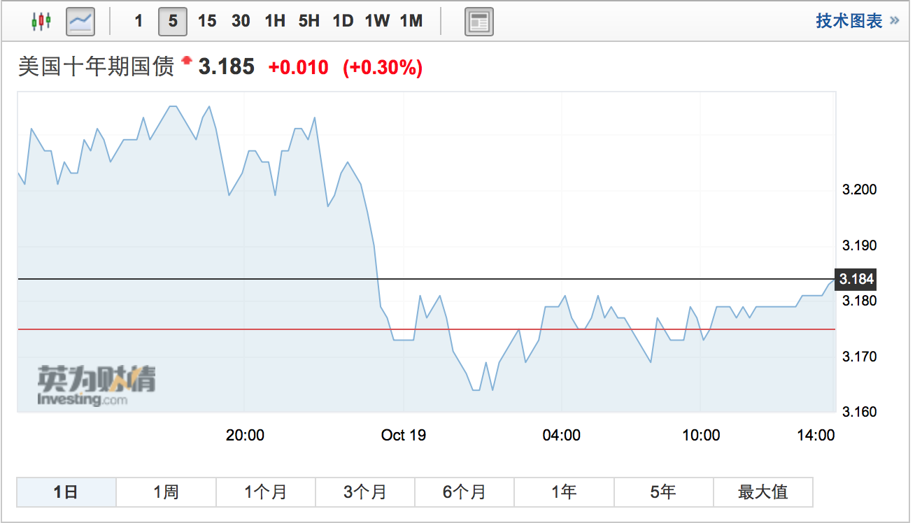 18日,10年期美债收益率又一度攀升至前期高位3.2%附近,截至第一财经记者19日下午截稿时,小幅回落至3.185。