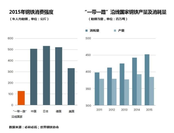 上述这些投资项目将催生大量对于建材和设备的需求,从而直接或间接地拉动钢铁需求。“一带一路”项目预计可催生多达1.5亿吨的钢铁需求增量,其中80%将用于建筑结构与钢筋混凝土中,而其余20%则将会用于机械制造及其它设备生产。如果平均分配到10年期内,相当于每年1500万吨的钢材需求增量,相当于“一带一路”相关地区的年均钢材需求的3%~4%。这是可观的增量,可使得2011年以来的本地钢铁需求增长率翻番。