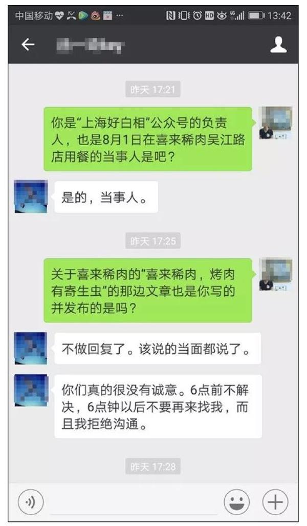 为此,“喜来稀肉”微信公众号8月2日发文称,那不是寄生虫,而是猪血管。并称公司已经和上述微信公众号沟通,接洽的“徐先生”提出要10万元封口费,下午六点前到账,否则将再次发送推文。事后查明,“喜来稀肉”猪肉没问题,而公司也向“上海好白相”提出8万元的索赔。