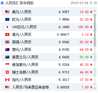 10月24日,人民币兑美元中间价报6.9357,调贬19点。上一交易日中间价6.9338;上一交易日官方收盘价报6.9374,上一交易日夜盘收盘报6.9411。 同时,中国央行今日开展1500亿元7天逆回购操作,今日无逆回购到期,连续第四个交易日净投放。