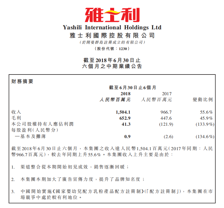 雅士利国际集团发布的2018年半年报显示,2018年上半年营收为15.04亿元人民币,比去年同期增长55.6%,毛利润为6.52亿元,同比增长45.9%,实现双增长。而其中集团旗下的有机奶粉品牌“瑞哺恩”与“Arla宝贝与我”(战略合作品牌),以及强势推出的羊奶粉品牌“朵拉小羊”和“多美滋”功不可没。