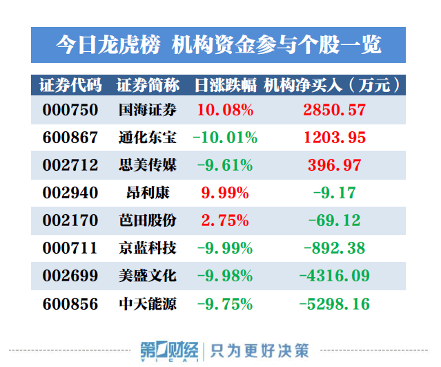 当天机构净买入前三的股票分别是国海证券、通化东宝、思美传媒,净买入金额分别为2851万元、1204万元、397万元。