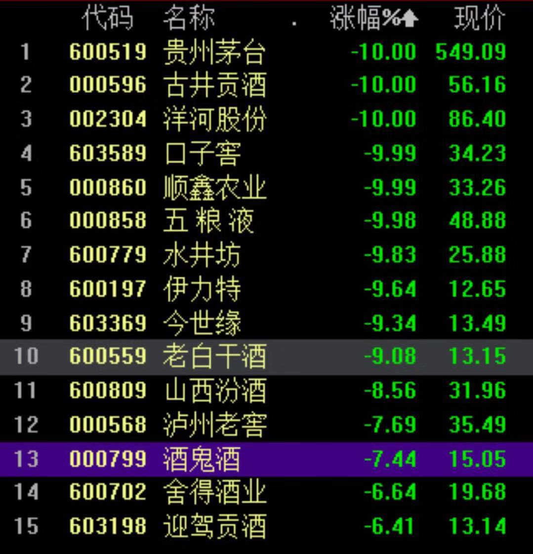 在贵州茅台带动下,白酒股全线大跌,口子窖、顺鑫农业、五粮液、洋河股份纷纷跌停,古井贡酒、水井坊、老白干酒大跌9%。