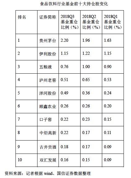从最近一个季度来看,Wind资讯数据显示,食品饮料板块基金重仓前五名中,白酒依然是大头。今年三季度食品饮料行业基金持仓前5名为贵州茅台、伊利股份、五粮液、泸州老窖、洋河股份。今年一到三季度,贵州茅台基金重仓比例呈持续上升趋势,单季度比例分别为1.63%、1.96%、2.20%。五粮液、泸州老窖在二到三季度间出现下滑。