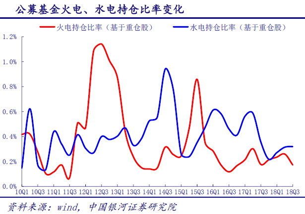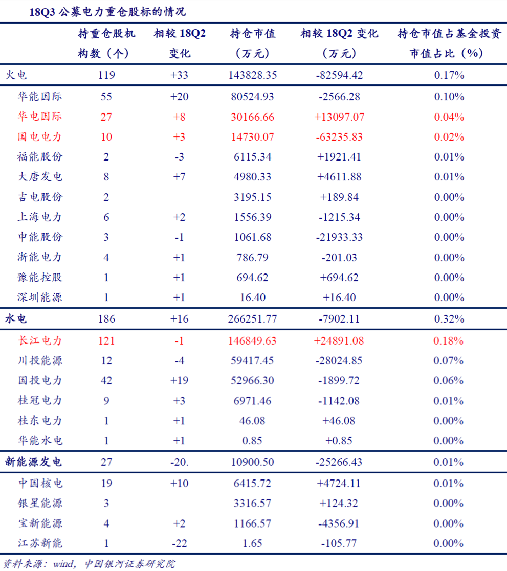 银河证券认为,在四季度市场风险偏好继续下滑的背景下,新增的机构或将逐步加持电力板块,持仓率有望回升。水电方面,长江电力在重仓股持股总市值下降的背景下逆势增加,持仓比重(持仓市值占全部重仓股市值)升至0.18%,占水电板块的55.1%(2018年一季度为25.3%、二季度为44.5%);火电方面,华能国际持仓比重稳定在0.10%,华电国际升至0.04%,国电电力降至0.02%。