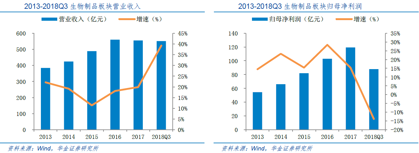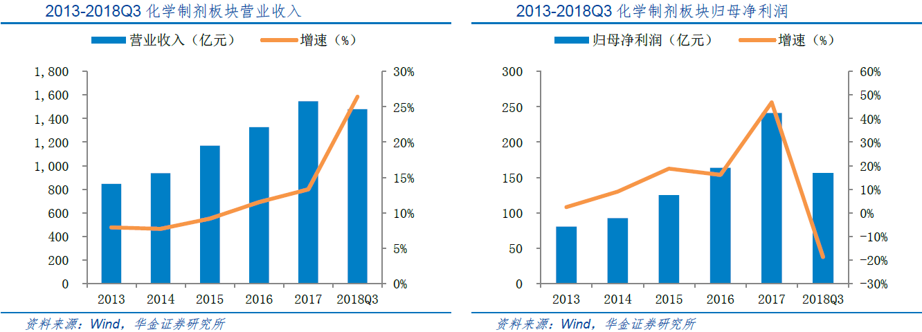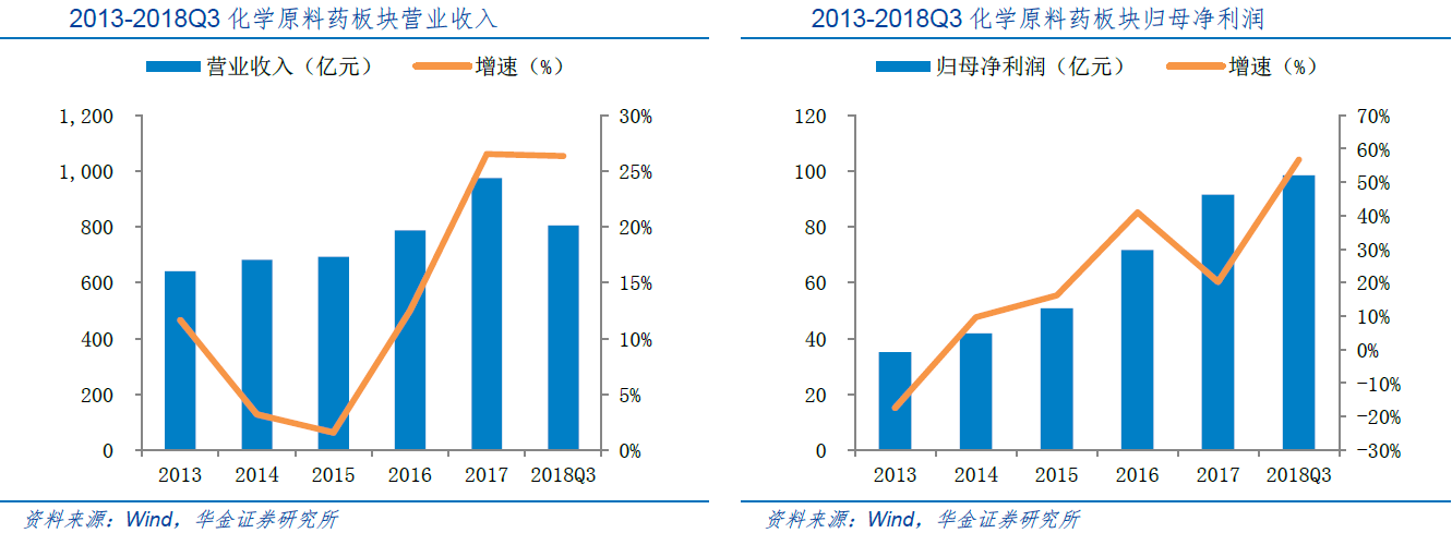 ①化学原料药:化学原料药板块2018年三季度实现营业收入804.99亿元,同比增长26.36%;归母净利润98.42亿元,同比增长56.82%。环保趋严带动原料药价格上涨,2018下半年业绩增速或放缓;