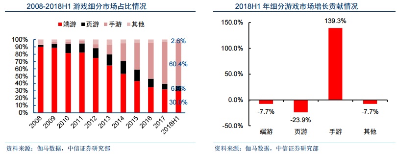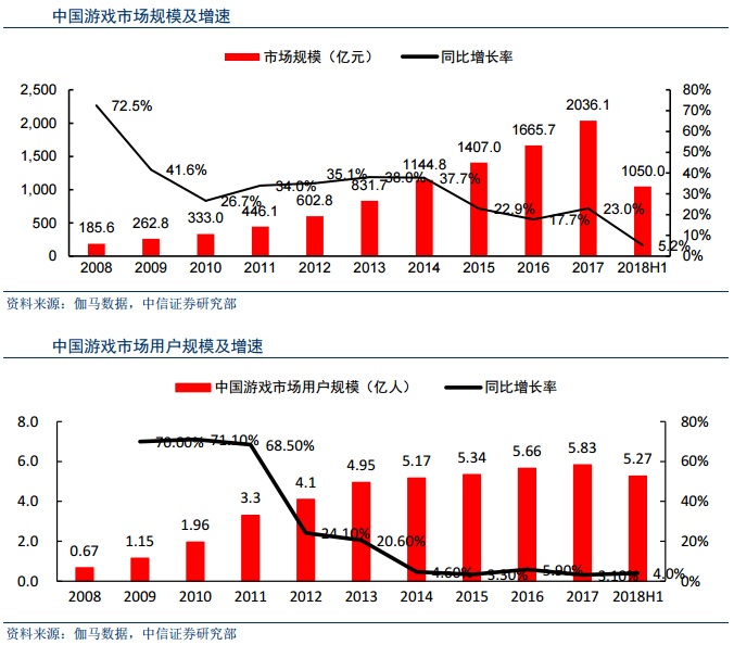 根据伽马数据,2018上半年中国游戏市场规模达1050.0亿元,同比増长5.2%;受游戏版号政策影响,行业增速放缓明显。市场结构上,2018上半年端游/页游/手游/其他游戏市场规模分别为3155/72.6/6341/278亿元,同比变化-1.3%/-14.7%/+129%/-126%,其中手游是唯一保持增长的细分市场。用户规模上,2018上半年中国游戏市场用户规模达527亿人,同比增长4.0%。中信证券发现,国内游戏用户规模整体趋近饱和状态。