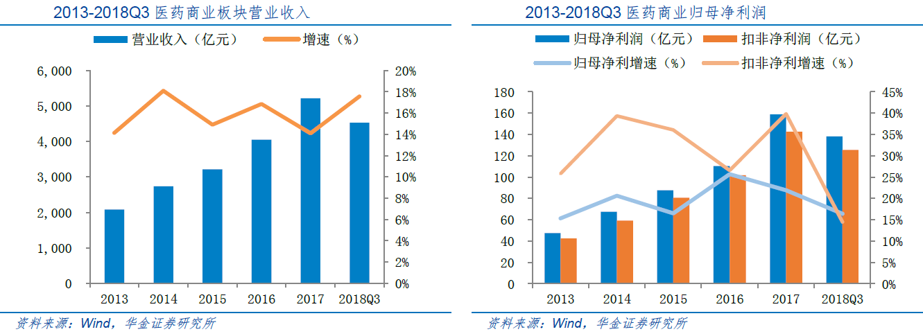 ⑤医药商业:医药商业板块2018年三季度实现营业收入4527.79亿元,同比增长17.57%;归母净利润138.21亿元,同比增长16.42%。两票制等重大政策已基本落地,行业或净迎来拐点;
