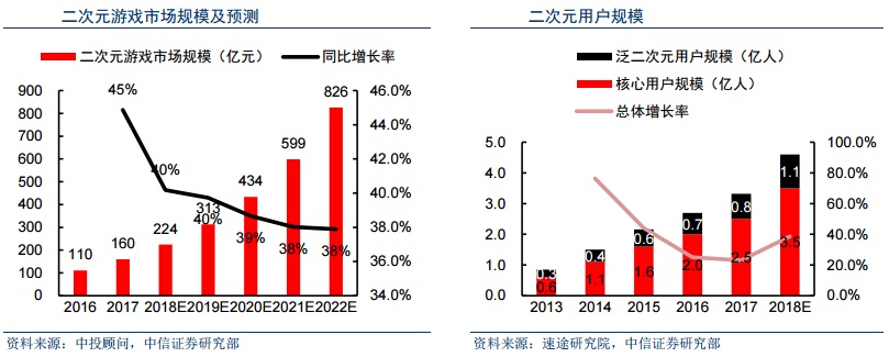 中信证券认为,二次元游戏是最具发展潜力的细分市场。根据中投顾问预测,2018年二次元游戏市场规模有望达224亿元,未来5年CAGR达38.6%,2022年规模达826亿元,增速远高于游戏行业整体增速;IP加成作用将进一步显现,2018上半年收入Top 100移动游戏中,具有IP的游戏收入占比达80.8%。从新游分布来看,2018第二、第三季度流水Top 10新游中,游戏IP及动漫IP占比最高;电竞产业将持续高景气,未来将成为游戏产业重要发展方向。用户规模方面,2017年国内电竞用户达2.7亿人,预计2018年突破3亿人。2018上半年中国电竞游戏市场规模达417.9亿元,同比增长16.1%。政策方面,电竞项目被多个国际体育组织认可,并纳入2020年亚运会正式项目。中信证券认为未来随着电竞生态逐步完善,电竞市场仍具有较强的发展潜力。