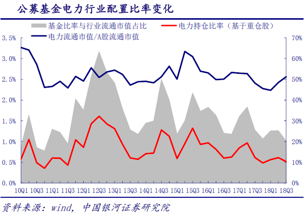 银河证券认为,将行业流通市值/A股流通市值作为对比指标,由于电力具有公共事业属性,板块防御性特征较明显,基金电力股的配置占比不高。根据公募基金重仓情况来看,2018年三季度基金配置电力行业重仓持股市值占全部重仓股市值比为0.52%,而同期电力流通市值/A股流通市值比为2.56%,比率从二季度的25.3%降至20.3%(历史均值为31.8%),创7年以来的新低。