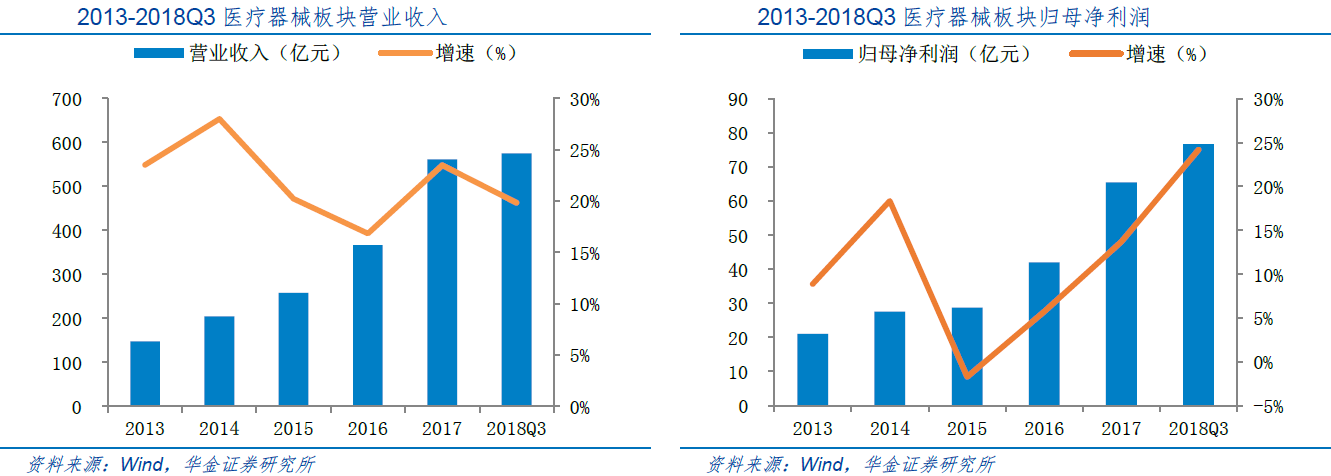 ⑥医疗器械:医疗器械板块2018年三季度实现营业收入574.58亿元,同比增长19.85%;归母净利润76.79亿元,同比增长24.18%。高值耗材和IVD板块整体向好,医疗器械进口替代的步伐亦不断加快;