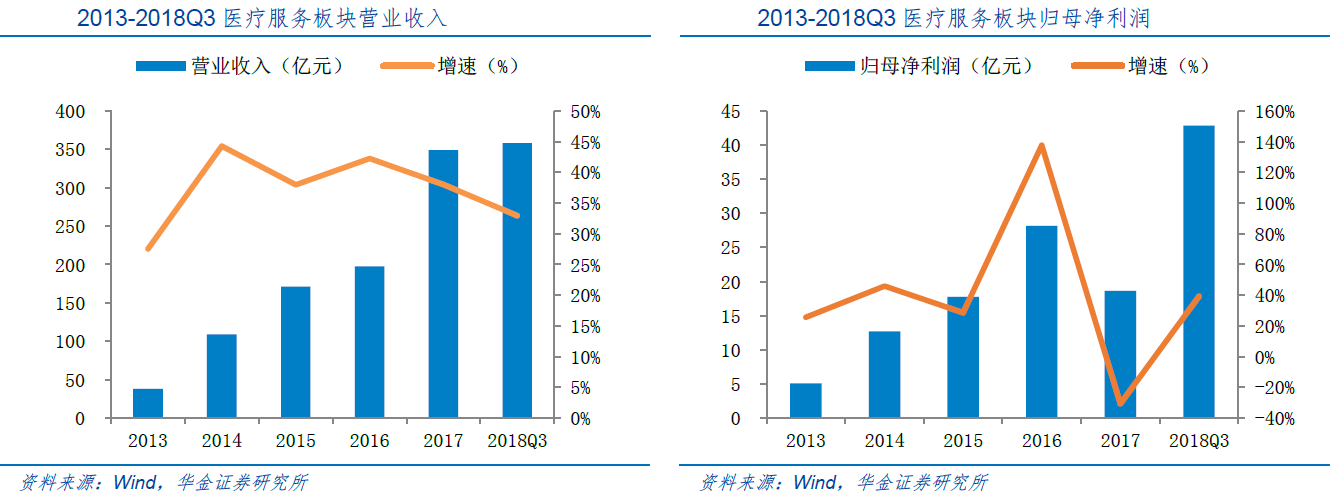 ⑦医疗服务:医疗服务板块2018年三季度实现营业收入357.98亿元,同比增长32.96%;归母净利润42.85亿元,同比增长39.26%。龙头盈利能力加强,引领板块增长。