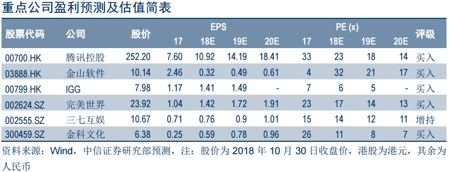 中信证券认为,游戏厂商破局点在于精品研发及长线IP运营、二次元等细分赛道、电竞产业等方面,持续看好头部游戏公司及在细分赛道具备强劲竞争力的公司的未来发展。重点推荐全产业链布局、全球研运一体龙头腾讯控股(0700.HK);具备长线IP运营能力的金山软件(3888.HK);出海成绩斐然,SLG游戏全球运营大厂IGG(0799.HK);精品游戏储备丰富,“STEAM中国”引进厂商完美世界(002624.SZ);具备全球优质IP,文化产业生态布局日益完善的金科文化(300459.SZ);建议关注“传奇+多品类”研发布局,买量运营优势强劲的三七互娱(002555.SZ)。