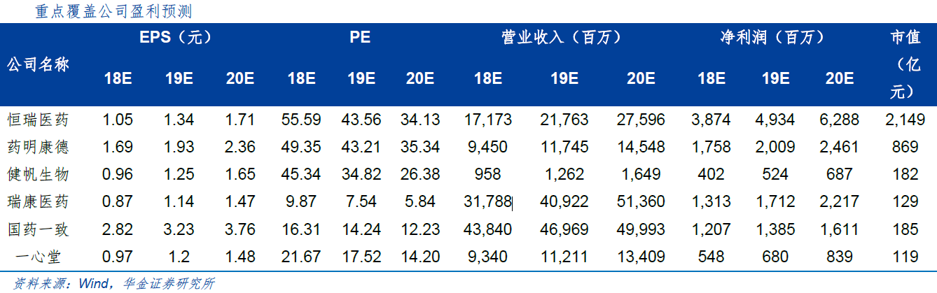 近年来,医药改革持续深入,供给侧改革深入进行,在医药研发和生产环节,通过政策引导,调整用药结构,促使真正具有临床价值的药品取代疗效不明确的药物对医药资金的占用,从而缓解医保资金压力,一方面鼓励创新,利好国内创新药龙头企业,华金证券建议重点关注医药龙头恒瑞医药(600276.SH),同时建议关注药明康德(603259.SH)、健帆生物(300529.SZ)。医药流通行业的改革也在深入进行,压缩流通环节,迫使着医药流通行业的供给侧改革,华金证券认为随着两票制、药品零加成、控制药占比等政策影响的逐渐消化,医药流通行业有望迎来触底反弹,建议重点关注瑞康医药(002589.SZ)、国药一致(000028.SZ);医药分开、处方外流趋势愈加明显,零售药房有望首先受益,建议重点关注一心堂(002727.SZ)。