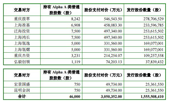 公告显示,调整后的交易方式为发行股份购买资产,上市公司拟以发行股份的方式购买重庆拨萃、上海准基、泛海投资、上海鸿长、上海瓴逸、上海瓴熠、重庆杰资、弘毅创领、宏景国盛、昆明金润合计持有的Alpha全部A类普通股,占Alpha全部股权的99.9783%。