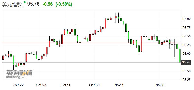 美元兑大多数主要货币汇率回落,美元指数跌至95.76,回吐了过去两周的所有涨幅。欧元兑美元汇率日内震荡剧烈,振幅接近80点,在选举结果基本确定后一路上扬,涨幅达0.4%,报1.1487 。现货黄金亦收复早前跌幅,日内上涨3.2美元,报1233美元/盎司。