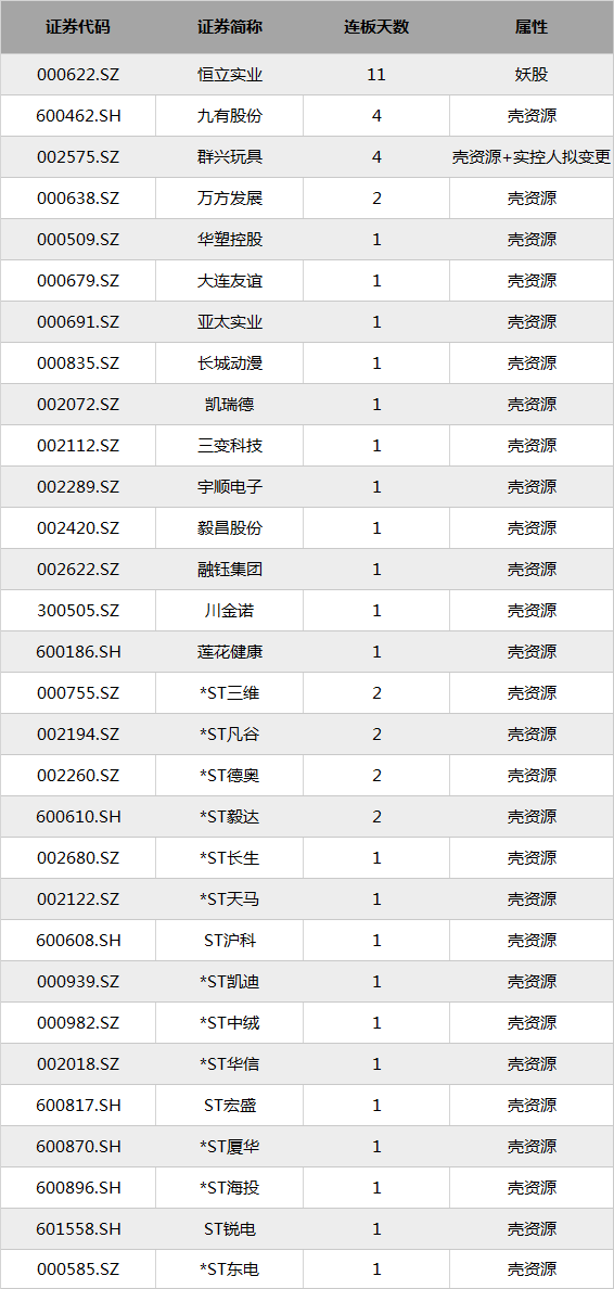 壳资源龙头恒立实业无疑是日内最大热点,斩获11连板,续创妖股连板记录,带动相关概念股走强,九有股份(600462.SH)、群兴玩具(002575.SZ)(叠加实控人拟变更)成功4连板,万方发展(000638.SZ)2连板,华塑控股(000509.SZ)、大连友谊(000679.SZ)、三变科技(002112.SZ)等相继封板。值得注意的是,盘中深交所向恒立实业下发关注函,要求恒立实业就股票交易异常波动说明相关问题。随后,恒立实业一度打开涨停。