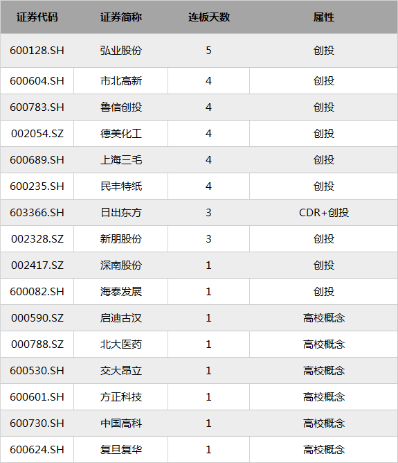 创投概念股延续分化态势,龙头市北高新(600604.SH)一字板,弘业股份(600128.SH)5连板,上海三毛(600689.SH)、鲁信创投(600783.SH)、德美化工(002054.SZ)、民丰特纸(600235.SH)斩获4连板,日出东方(603366.SH)(叠加CDR概概念)3连板。盘后消息面上,证监会副主席方星海表示,无论是科创板,还是注册制,都必将给中国股市生态带来巨大改变,将会有更多科技创新企业能够成功上市。