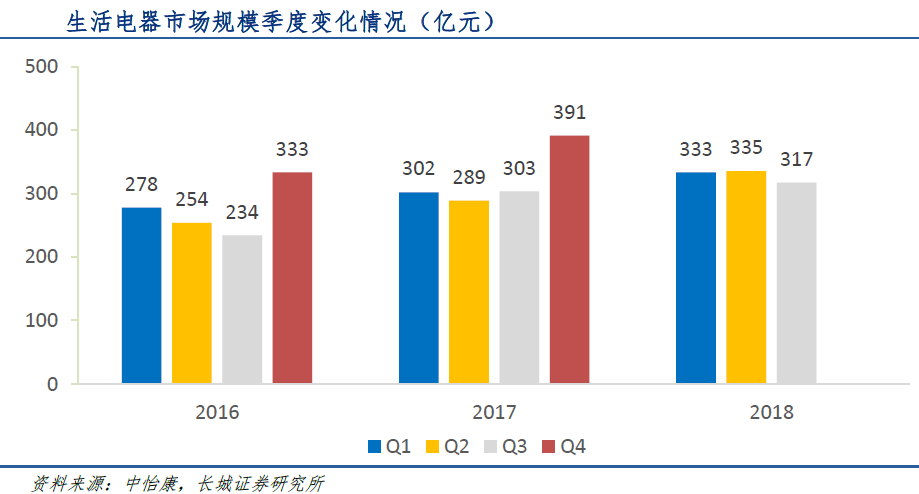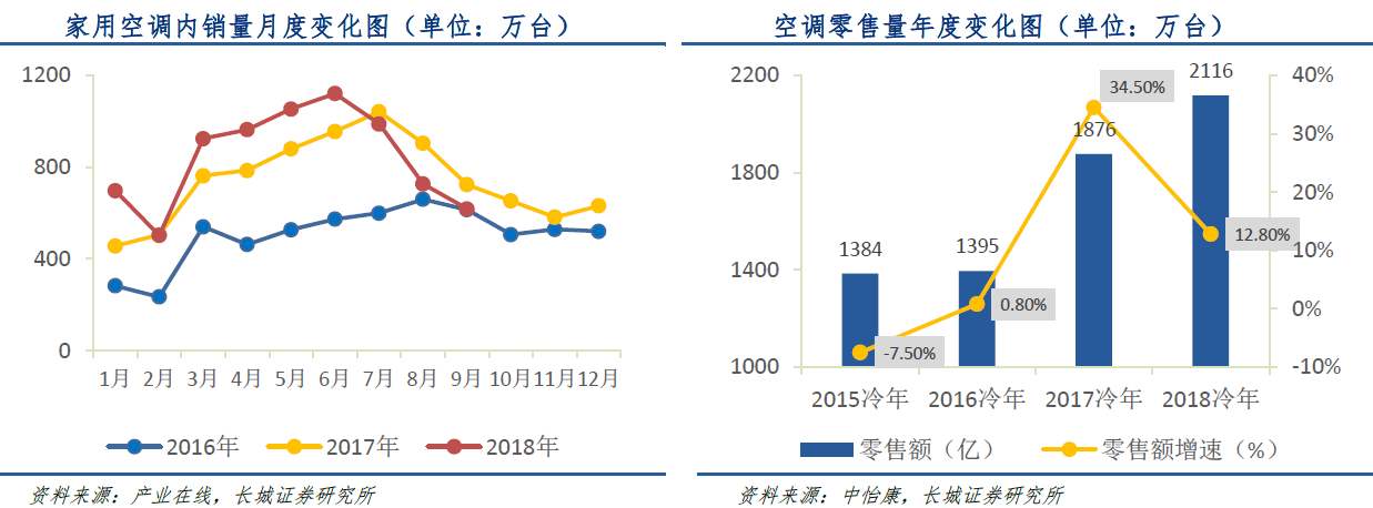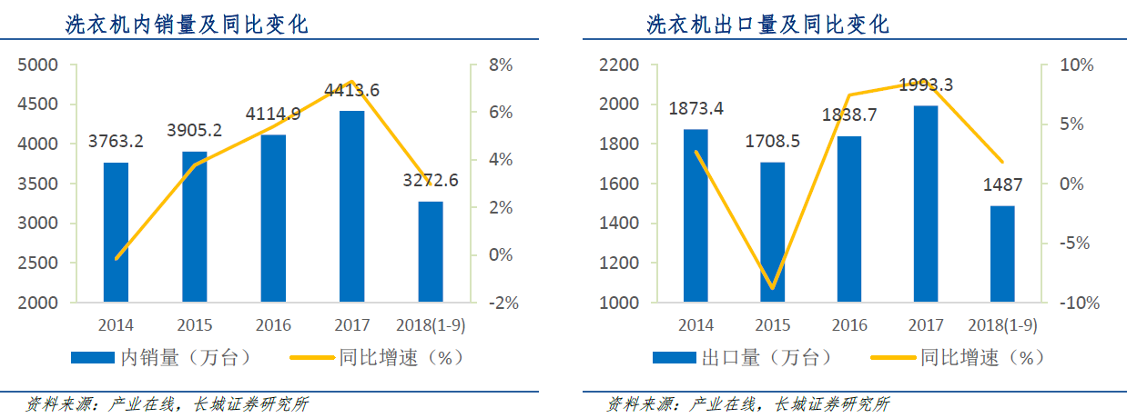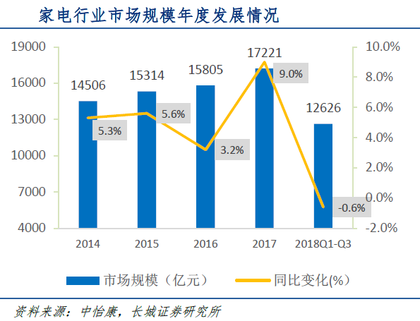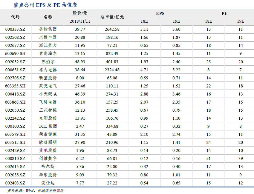 从子行业情况来看,据产业在线数据,空调2018冷年出货量同比大涨19%,虽然九月份之后空调销量出现下滑进入去库存周期,但从全年来看在2017年高基数前提下依然可以实现可观上涨,洗衣机、冰箱前三季度亦表现稳健。长城证券认为,长期来看,消费升级将驱动白电行业升级换代同时促进新兴品类不断发展。