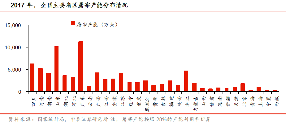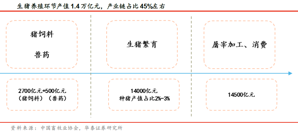 生猪产业链条主要由原料、生猪繁育、屠宰加工消费三个环节构成,根据华泰证券测算,2016年,三个环节总产值超过3万亿元,其中,繁育环节占比45%左右,达到1.4万亿元左右。
