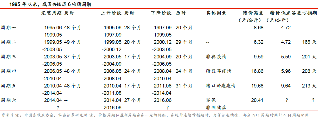 华泰证券认为,人性周期和生产的滞后性是猪周期形成的根本原因,通常一个完整的周期为3~4年的时间。1995年以来,我国共经历6轮猪周期,受投入品花费上涨的影响,猪周期底部价格也整体随之抬升。