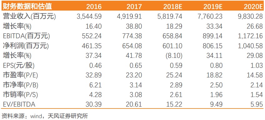 此外,公司现金储备充足,质押率、负债率、现金流等指标均较为优异,良好的财务状况将帮助公司稳固经营并助力外延并购。公司此前已推出股权激励计划,重点鼓励公司战略业务,股权激励将理顺内部机制,公司发展进入转型收获期。天风证券预计公司2018/2019/2020年EPS分别为0.59/0.80/1.03元:公司业务转型升级,综合竞争力强,增长速度快,看好公司业务发展前景,维持“买入”评级。