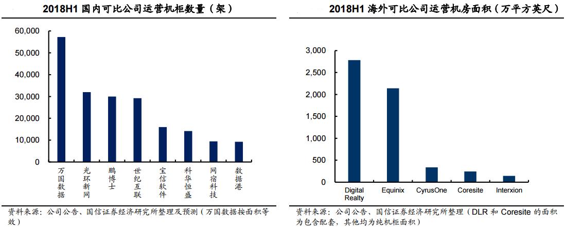 国信证券指出,值得注意的是,与全球最大数据中心市场,美国相比,中国仍存在相当大差距。据Synergy Research最新数据,截至2017年底,美国占全球超大规模数据中心市场44%份额,中国占据8%的市场份额,不到美国的1/5。在运营规模上,我们可以看到,国内IDC服务商与全球巨头亦存在较大差距,即便目前国内拥有机柜最多的万国数据,运营机柜数不足龙头Equinix的1/4。