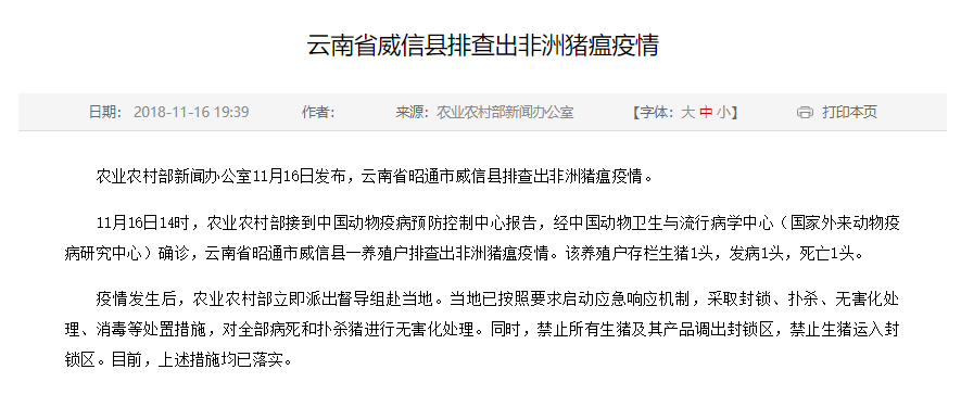 据农业农村部新闻办公室消息,11月16日14时,农业农村部接到中国动物疫病预防控制中心报告,经中国动物卫生与流行病学中心(国家外来动物疫病研究中心)确诊,云南省昭通市威信县一养殖户排查出非洲猪瘟疫情。