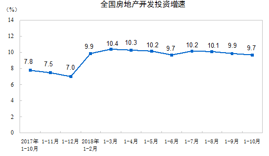 11月14日,国家统计局发布数据显示,1~10月份,全国房地产开发投资99325亿元,同比增长9.7%,增速比1~9月份回落0.2个百分点。其中,住宅投资70370亿元,增长13.7%,增速回落0.3个百分点。住宅投资占房地产开发投资的比重为70.8%。