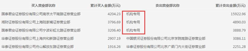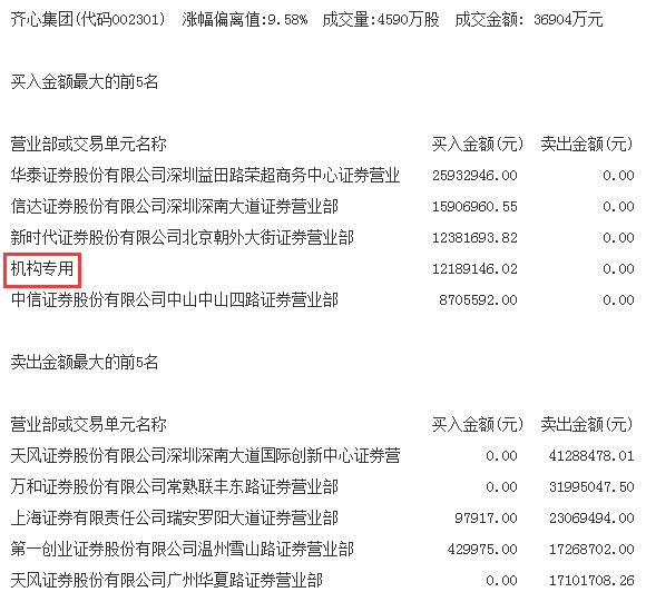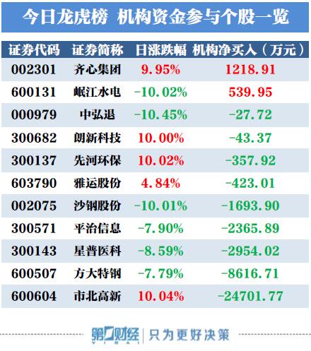当天机构净买入前两只股票分别是齐心集团、岷江水电,净买入金额分别为1219万元、540万元。
