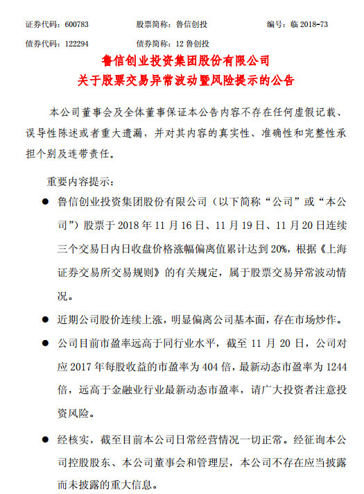 鲁信创投20日发布风险提示公告称,近期公司股价连续上涨,明显偏离公司基本面,存在市场炒作。公司目前市盈率远高于同行业水平,截至11月20日,公司对应2017年每股收益的市盈率为404倍,最新动态市盈率为1244倍,远高于金融业行业最新动态市盈率,请广大投资者注意投资风险。同时,截至目前本公司日常经营情况一切正常。