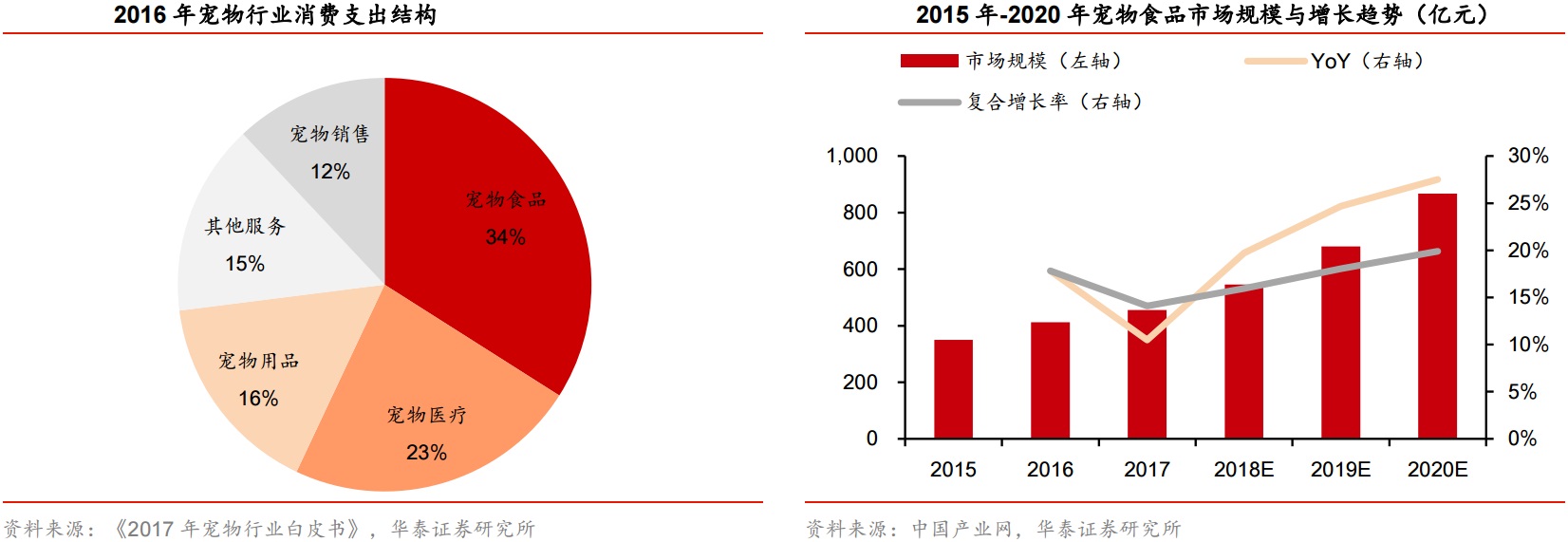 作为宠物市场的刚性需求,宠物食品市场也有着增长快、潜力大的特点。2016年,我国宠物食品规模占到整个宠物产业的34%。根据前瞻产业研究院报告,截至2015年底,我国宠物食品市场规模达到350亿元,华泰证券预计2018年至2020年仍保持20%的复合增速,到2020年规模可达千亿元,成为全球第三大宠物食品市场。