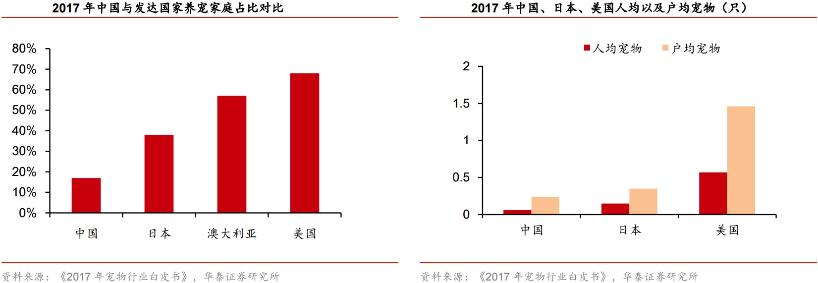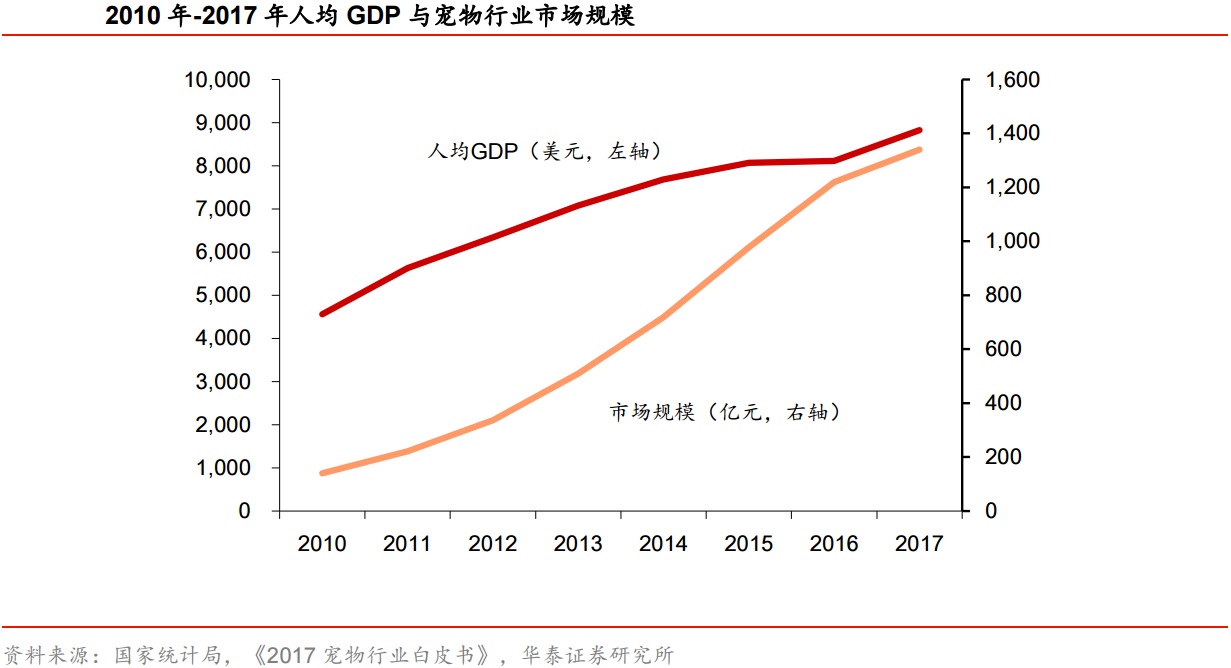 华泰证券指出,我国人均宠物数量仍处于较低水平,增长潜力较大。2017年我国养宠家庭总共5912万户,占比17%,日本、澳大利亚和美国养宠家庭比例分别为38%,57%和68%。截至2017年我国宠物市场规模达到1340亿元,但若国内家庭养宠数量达到日本水平,则养宠家庭数量能够增至1.32亿户,用现在的户均消费水平计算,行业规模或达到2995亿元;若能够达到美国水平,则养宠家庭可达2.36亿户,行业规模将突破5000亿元。
