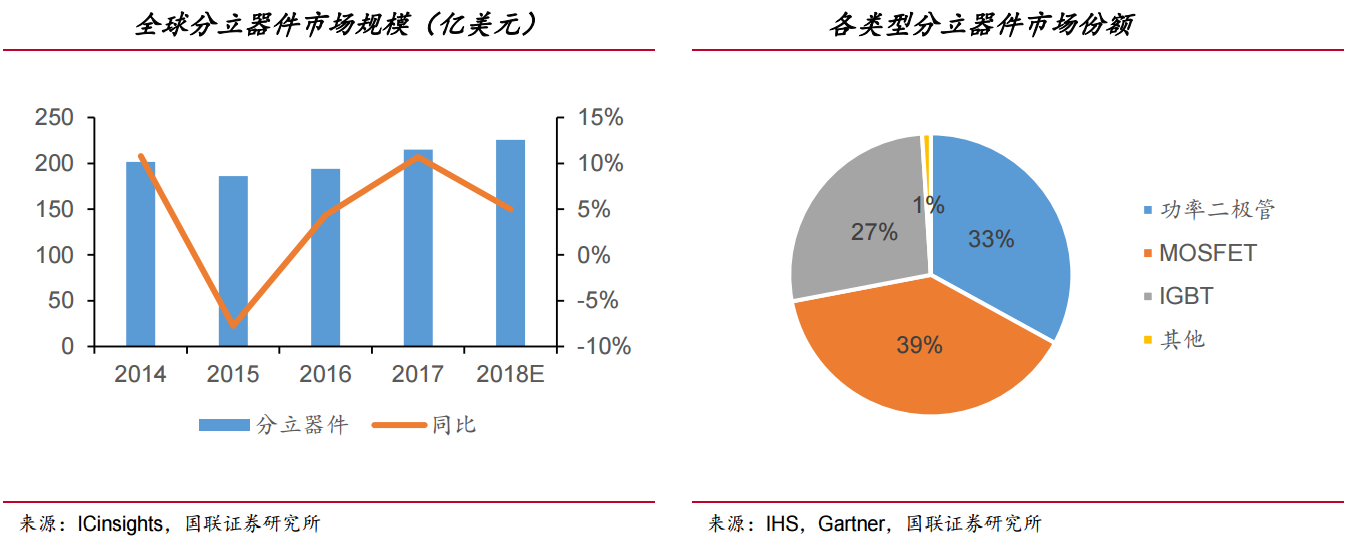 据ICinsights数据,2017年全球半导体分立器件市场规模为215亿美元,占整个半导体市场规模的5%~6%之间。预计2017~2022年全球分立器件市场将以3.1%的年复合增长率增长至287亿美元。各类分立器件中,2016年功率二极管、MOSFET、和IGBT分别占据33%、39%和27%的市场。