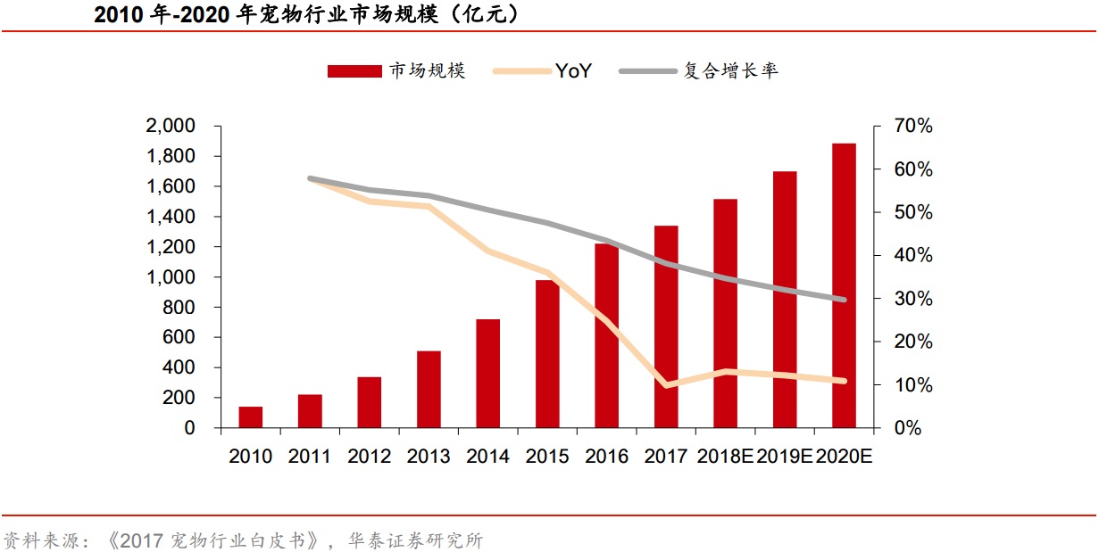 我国宠物市场规模从2010年到2017年,年复合增长率达到30%。根据《2017年宠物行业白皮书》预测,2020年宠物市场规模可达1885亿元。快速增长的行业规模带动了业内企业营收快速增长,看好宠物食品行业未来前景,华泰证券认为,中宠股份(002891.SZ)、佩蒂股份(300673.SZ)等国内龙头标的正积极布局国内电商渠道、增强品牌差异化、积极抢占国内市场份额,有望受益于行业规模增长。