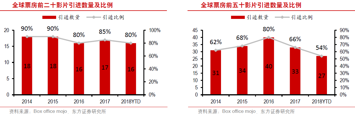 东方证券详细统计了2014~2018年全球票房前100影片的引进情况,可以发现在目前进口片的配额下,真正的大制作、高票房和高口碑电影已基本引进。2014~2017年,全球票房前二十影片的引进比例达90%、90%、80%和85%,全球票房前五十的引进比例为62%、68%、80%和66%。2018年1-10月,票房前20影片引进比例与之前年份基本一致,但票房前50影片仅引进27部,引进比例54%,引进数量明显偏少。东方证券认为,核心原因在于2018年是好莱坞影片小年,除TOP20大片外,腰部影片质量平淡,存在较多音乐剧、恐怖片等未能引进。