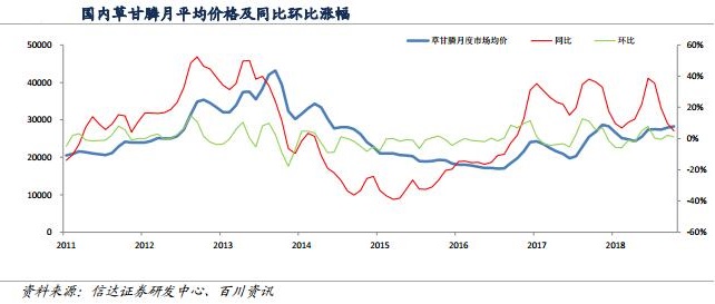 目前草甘膦价格为28500元/吨(95%原粉华东地区价格),与上月同期持平。甘氨酸价格增加至16700元/吨,IDAN价格上涨至14000元/吨,黄磷价格上涨至16900元/吨,草甘膦企业生产成本上涨。2018年10月草甘膦华东市场均价为28210元/吨,相比上年同期增加5.0%,月均价环比上涨1.0%。