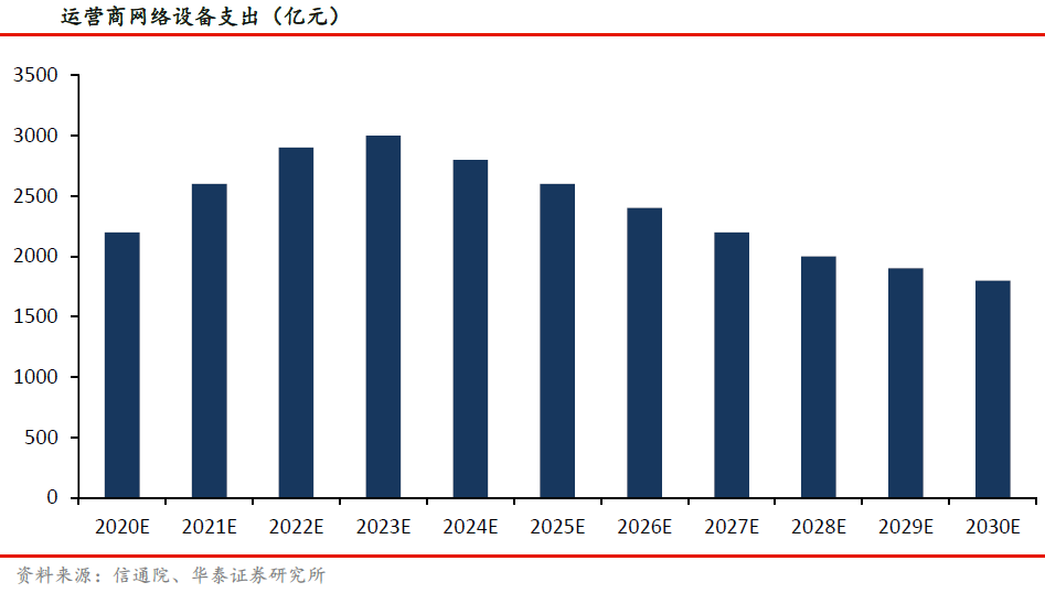 华泰证券预计5G投资规模相比于4G将有比较大的提升。截止2017年三大运营商4G累计CAPEX投入14593亿元,年平均投资额为3648亿元。5G因支持更多场景,生命周期会长。根据信通院测算,我国5G在商用后的第四年(2023年)网络设备支出达到最大,之后开始下降。如果考虑更长的生命周期,预计5G建设周期的十年内,运营商用于网络设备的支出将达到2.64万亿。
