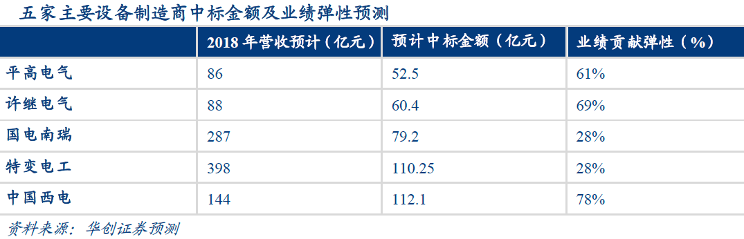 受益于特高压投资计划的兑现,华创证券预计特高压主要设备制造商即将迎来业绩拐点,相关标的PE、PB等估值指标料将得以修复。经测算,平高电气、许继电气、国电南瑞、特变电工、中国西电五家主要上市公司在本轮特高压投资中有望分别获得52.5亿元、60.4亿元、79.2亿元、110.25亿元、112.1亿元订单,剔除订单兑现跨年影响,测算出新增订单对应2018年营业收入业绩弹性分别为61%、69%、28%、28%、78%。