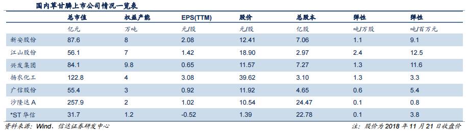 A股市场上控制有草甘膦权益产能的公司共8家,信达证券重点跟踪新安股份(600596.SH)、扬农化工(600486.SH)、江山股份(600389.SH)以及兴发集团(600141.SH)。比较而言,新安股份、兴发集团单位市值对应草甘膦产能较大,其他业务中有机硅也处于底部反转之中,是首选的股票;同时,兴发集团由于具有一体化产业链将充分受益于甘氨酸和草甘膦价格的上涨;江山股份受到草甘膦价格波动影响产生的业绩弹性大,估值空间较大,但风险也相对较高。扬农化工其他业务(麦草畏和拟除虫菊酯类杀虫剂)更加出色,业绩和估值受草甘膦波动影响而产生的风险较小。