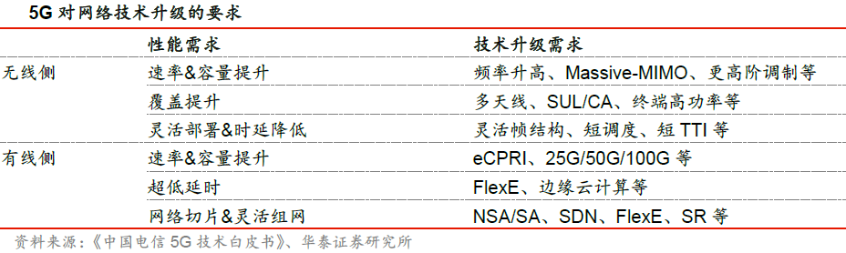 5G将在网络带宽、连接密度、时延、同步、成本和效率上有更高的要求,5G网络无论在有线侧还是无线侧都需进行技术升级。主要变化有:5G空口需引入大规模阵列天线技术(Massive-MIMO);基站架构发生变化,天线有源化趋势明显;承载网升级,NSA/SA部署方案选择。